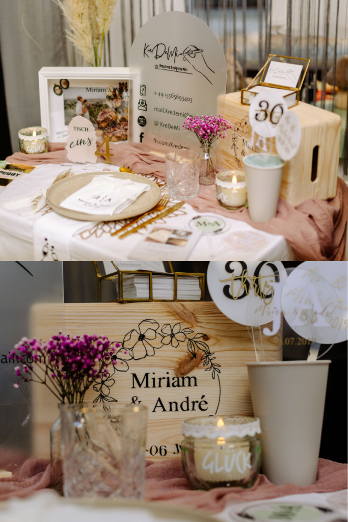 Zusätzlich gestaltet Miriam individuelle Hochzeitsdekorationen wie Namensschilder, Caketopper, Tischschilder sowie personalisierte Geschenke und Erinnerungsboxen – liebevolle Details, die Hochzeiten einzigartig machen.